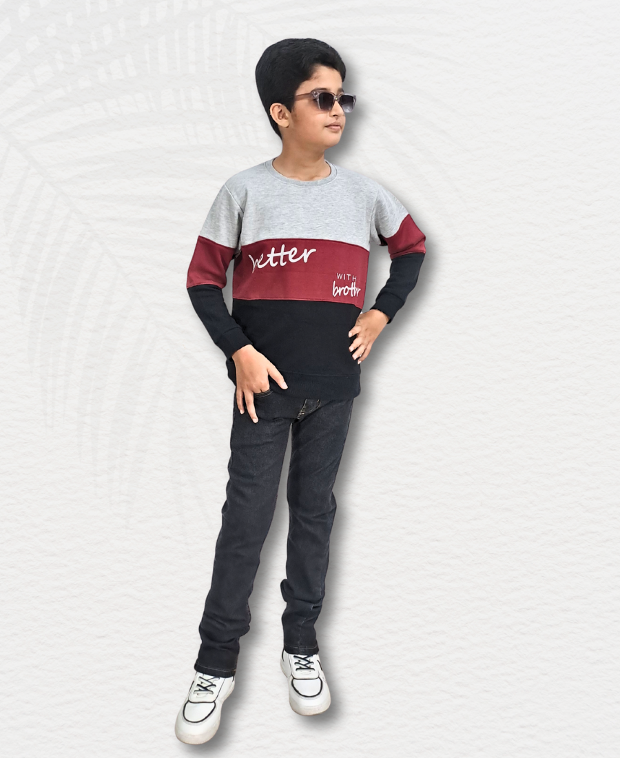 This 3 Colors Striped Boys Sweat Shirt combines maroon, grey, and black stripes in a soft, comfortable fabric that keeps your child warm during winter. Its elegant design is ideal for both formal and semi-formal occasions, making it a versatile and stylish choice. An excellent addition to your little hero’s wardrobe, it blends practicality with a polished look effortlessly.