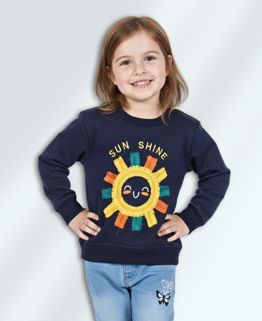 This Girls Blue Embroidered Sweatshirt is designed for winter wear, featuring vibrant towel embroidery of Sun Shine that adds a refined touch to your child's outfit. Its detailed, colorful stitching enhances the look, making it ideal for both semi-formal and formal occasions. Crafted to combine warmth with style, this sweatshirt ensures your child stays comfortable while looking effortlessly elegant.