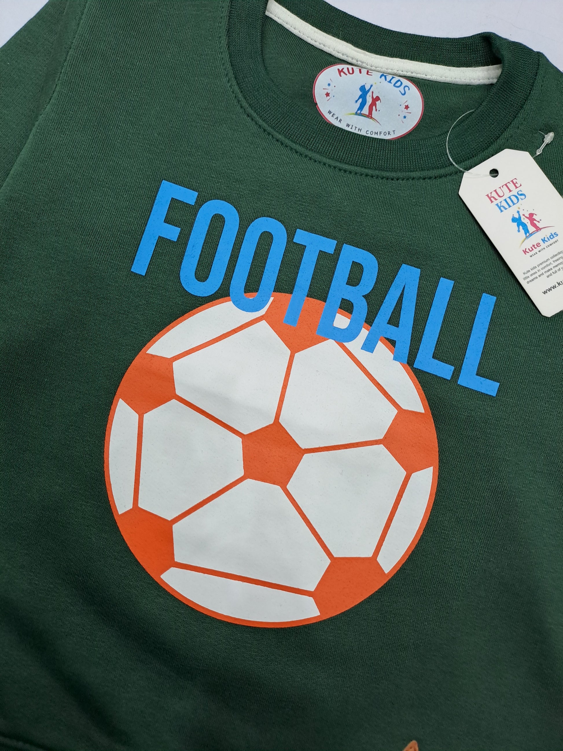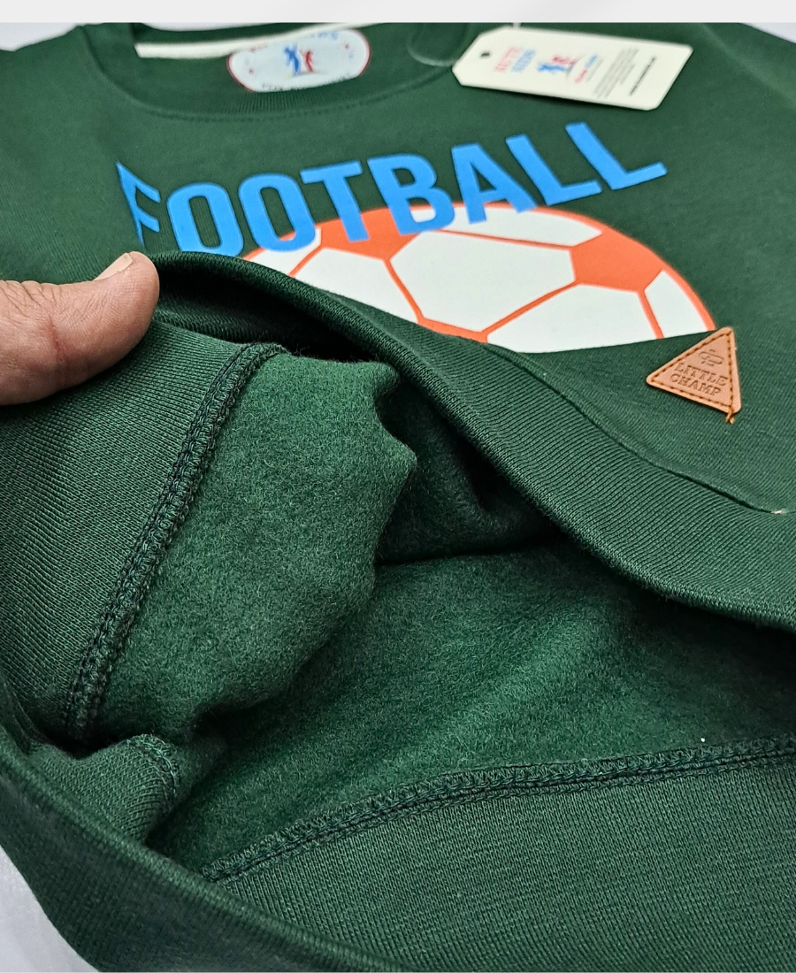 This Boys' Green Sweat Shirt provides dependable warmth and comfort, perfect for winter. Its vibrant "Foot Ball" design adds a lively accent without compromising versatility, making it suitable for various occasions and energetic play. Crafted for durability and coziness, it is an excellent layering piece to keep your child comfortable during colder season