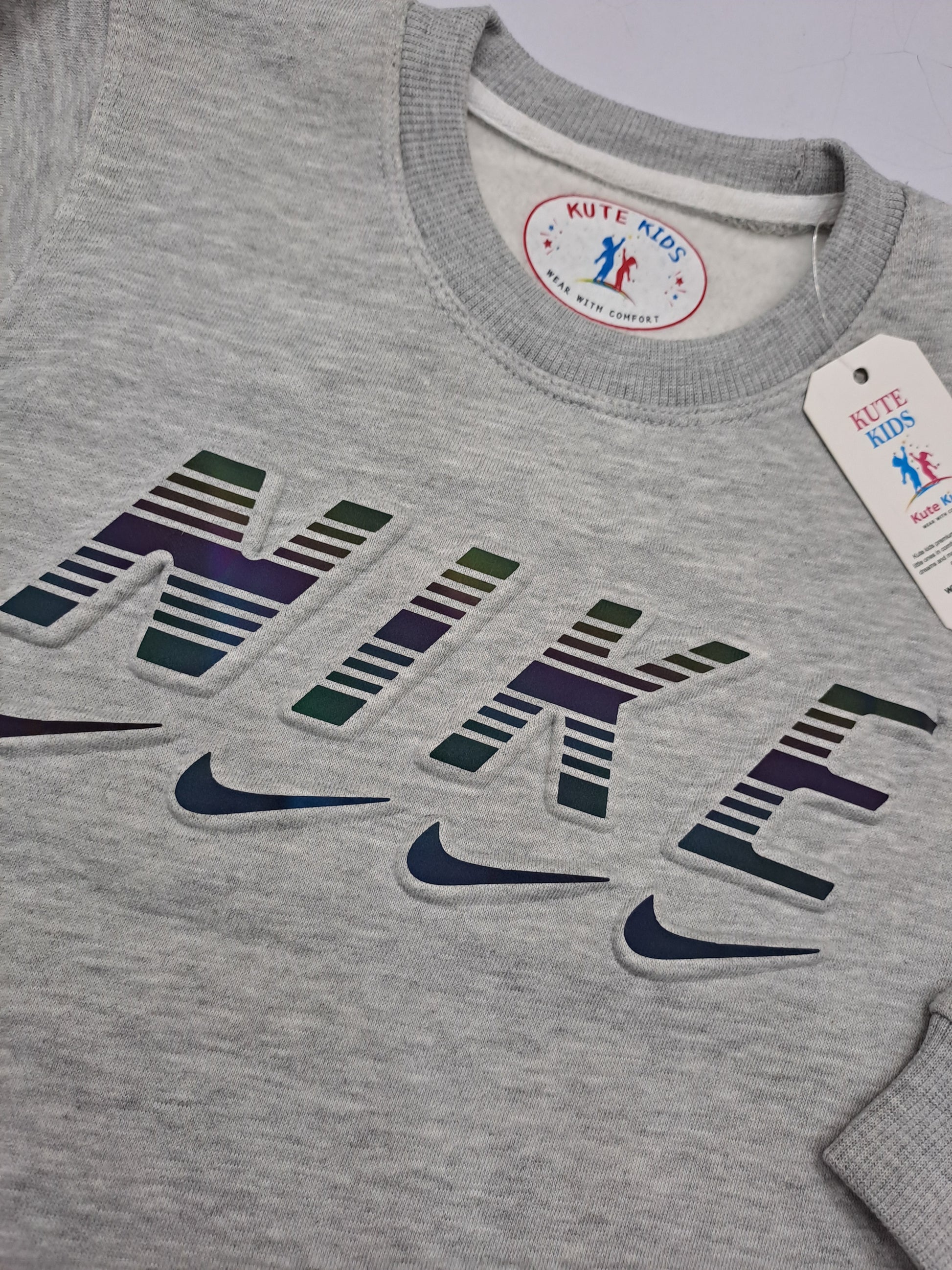 This Boys' Light Grey Sweat Shirt offers reliable warmth and comfort, ideal for winter wear. Featuring a vibrant "NIKE" motif, it adds a cheerful touch to your child's outfit while maintaining a versatile style suitable for any occasion. Durable and cozy, it’s a practical choice for layering during colder months