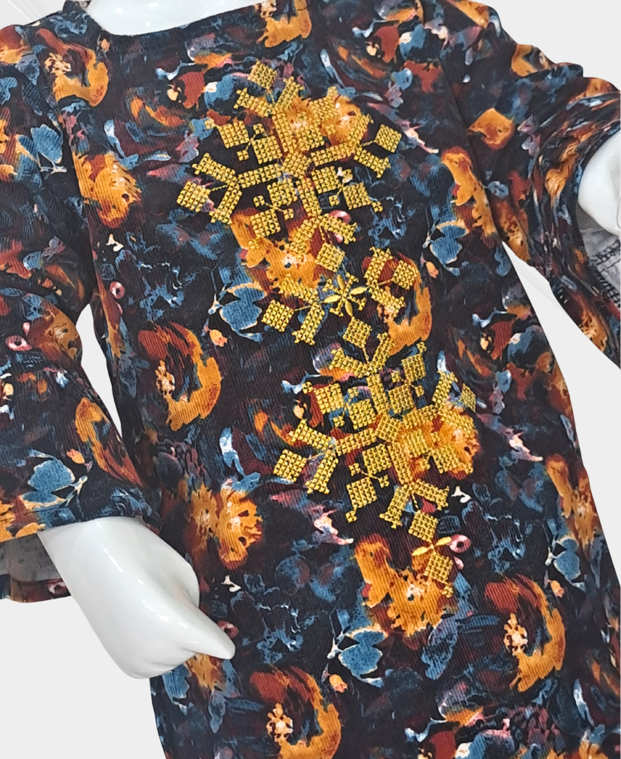 Stay stylish in this corduroy top with a Embroidered neckline, two-button placket at back for easy to wear, full sleeves, vibrant multi colored printed straight shirt.